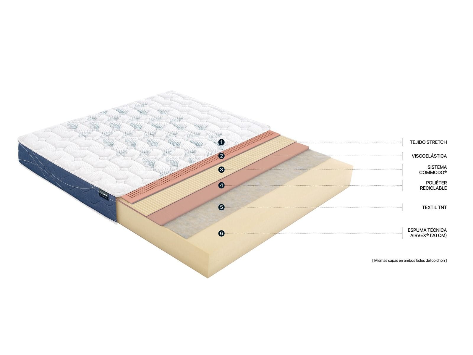 3 capas compuestas por materiales de alta calidad (viscoelástica, sistema Commodo y poliéter reciclable) que se amoldan al cuerpo para mejorar la comodidad.