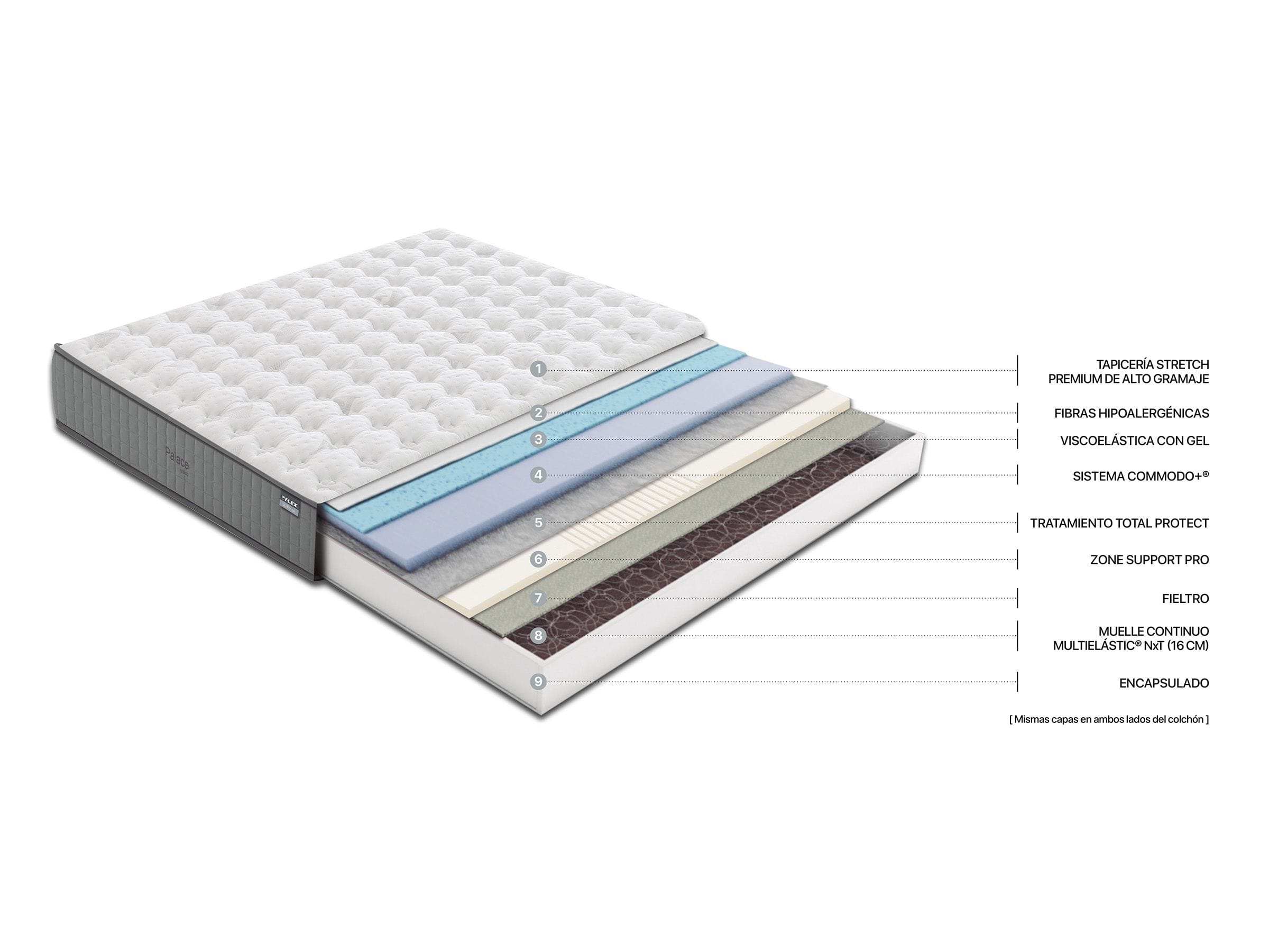 5 capas de compuestas por materiales de alta calidad (fibras hipoalergénicas, viscoelástica con gel, sistema Commodo+, Confort System+ y fieltro de alta resistencia) que se amoldan al cuerpo para mejorar la comodidad.
